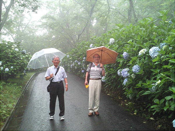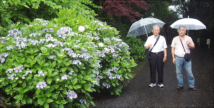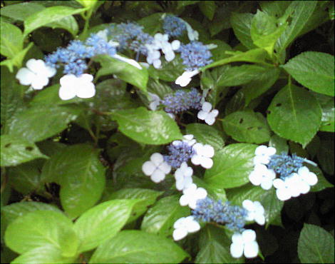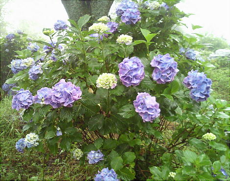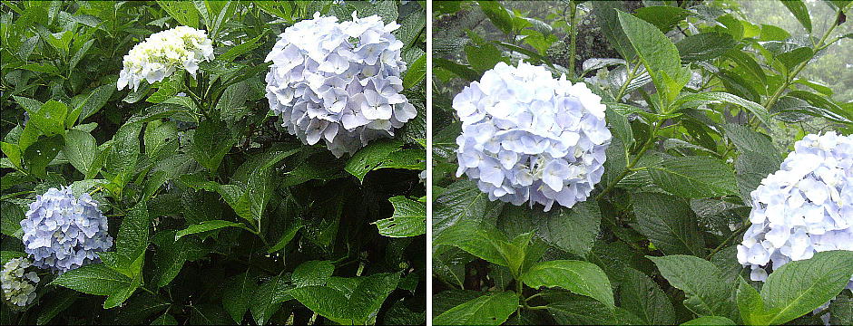 アジサイが真っ盛りに咲いて、梅雨の雨に打たれてすこぶる美しい。