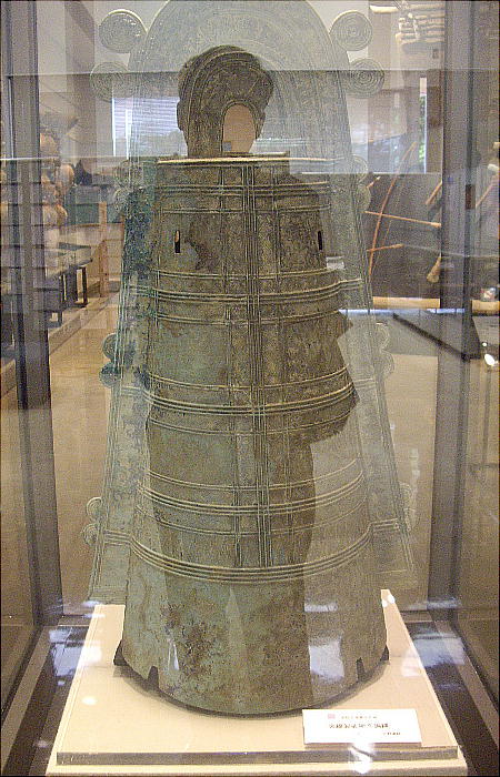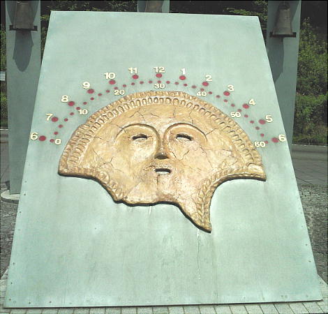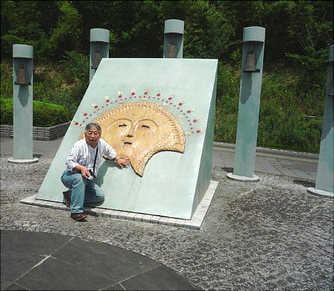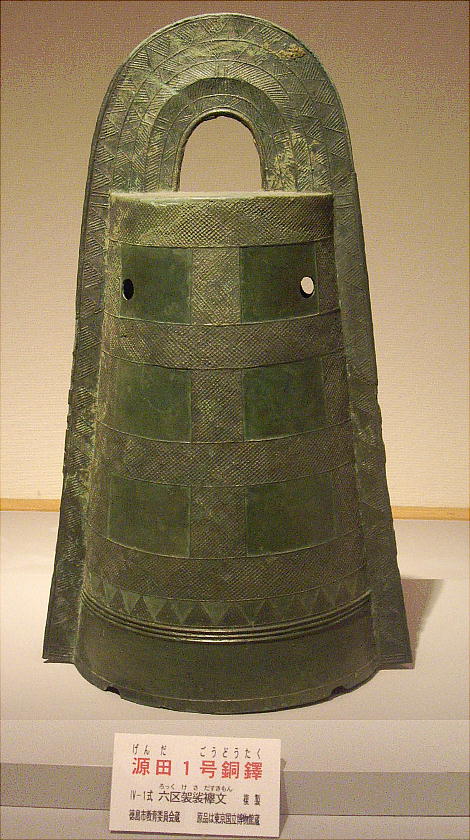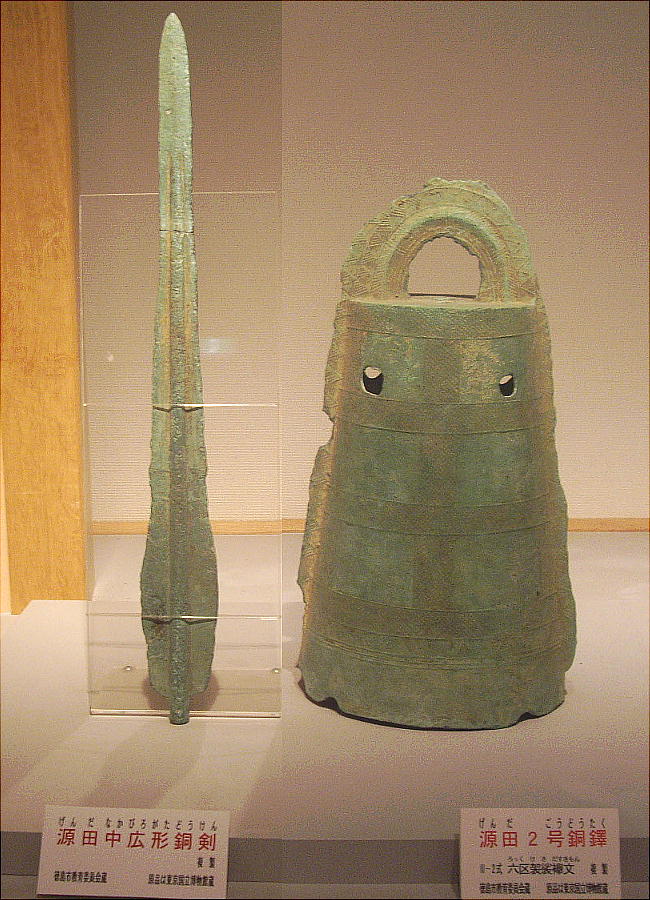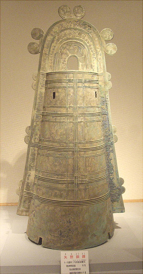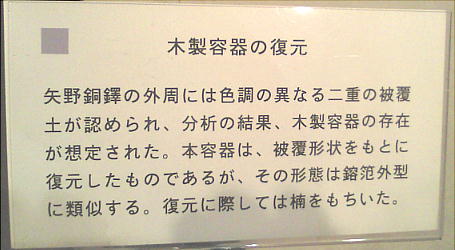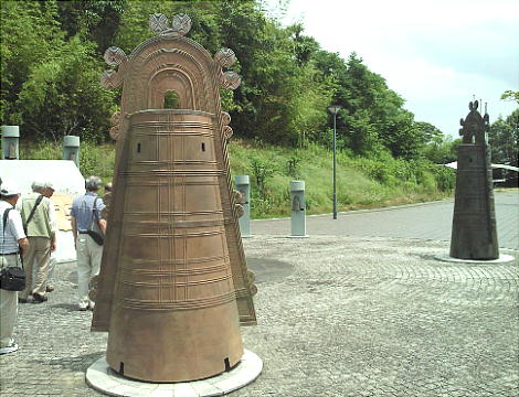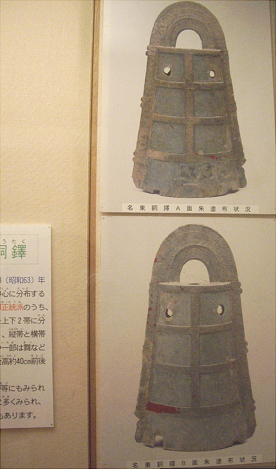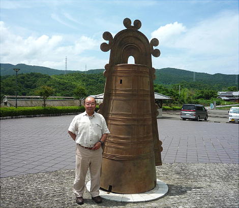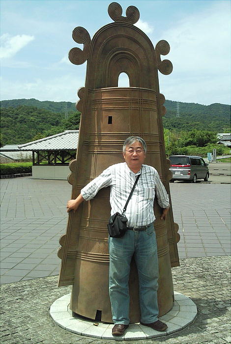 矢野遺跡から出土した銅鐸のレプリカの前で。下は「仮面土器」がモチーフのようだ。