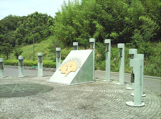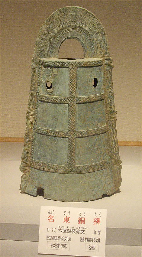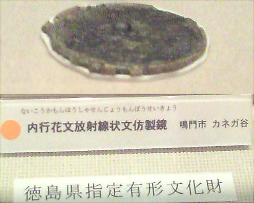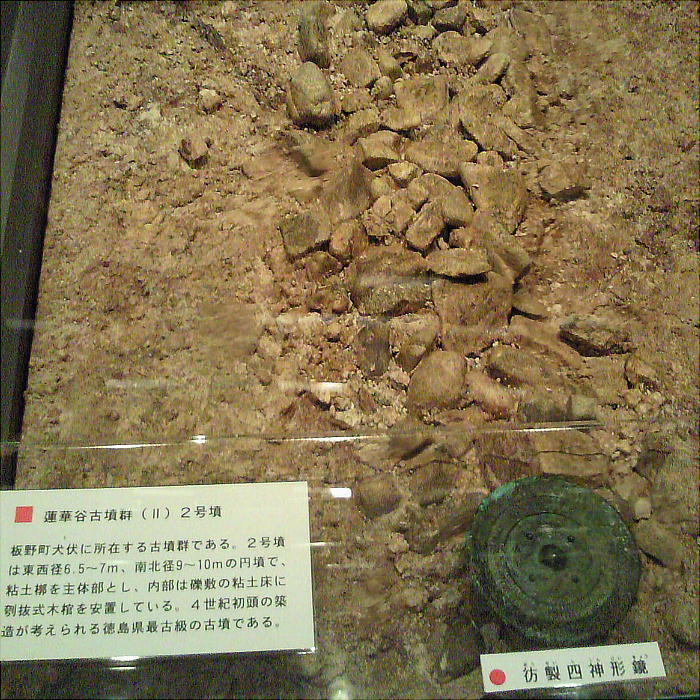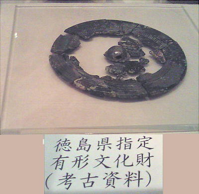 阿波史跡公園の入口にある、宮谷古墳から出土した「三角縁銘帯六神四獣鏡」である。宮谷古墳は、延喜式内大社「天石門別八倉比賣