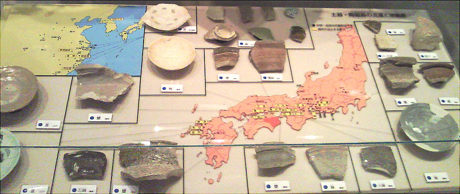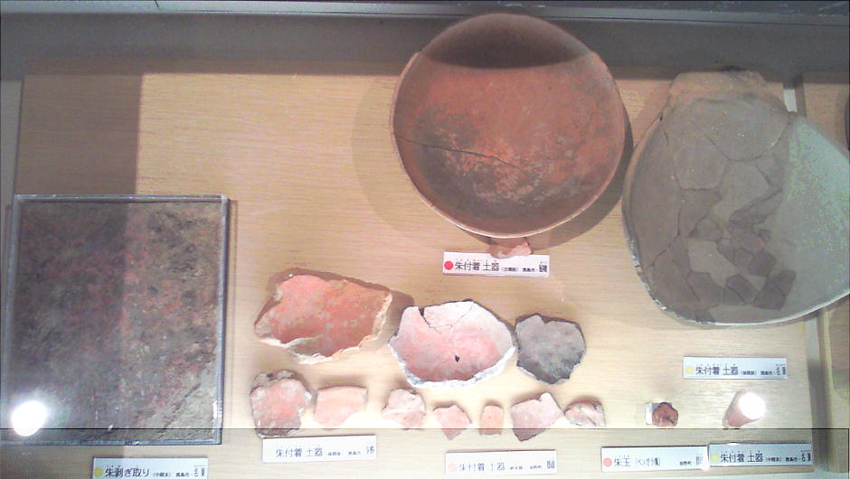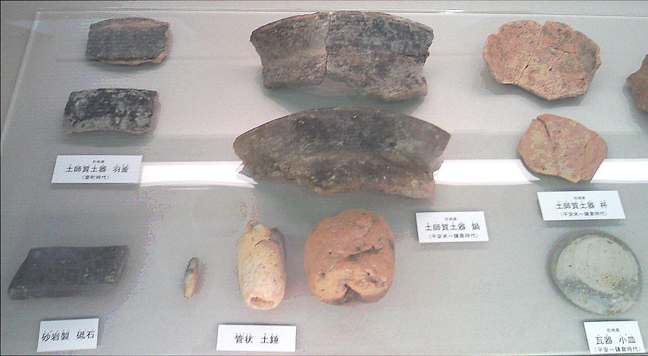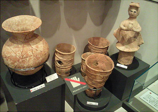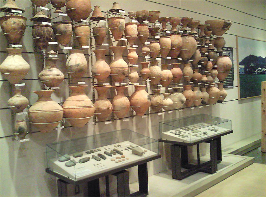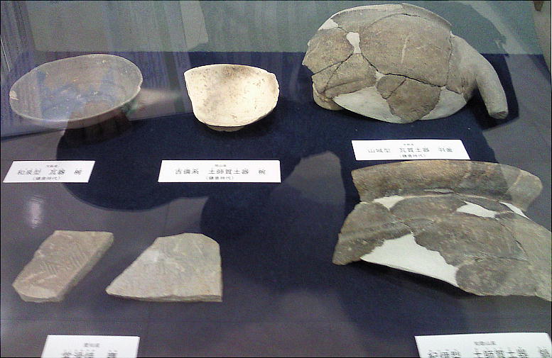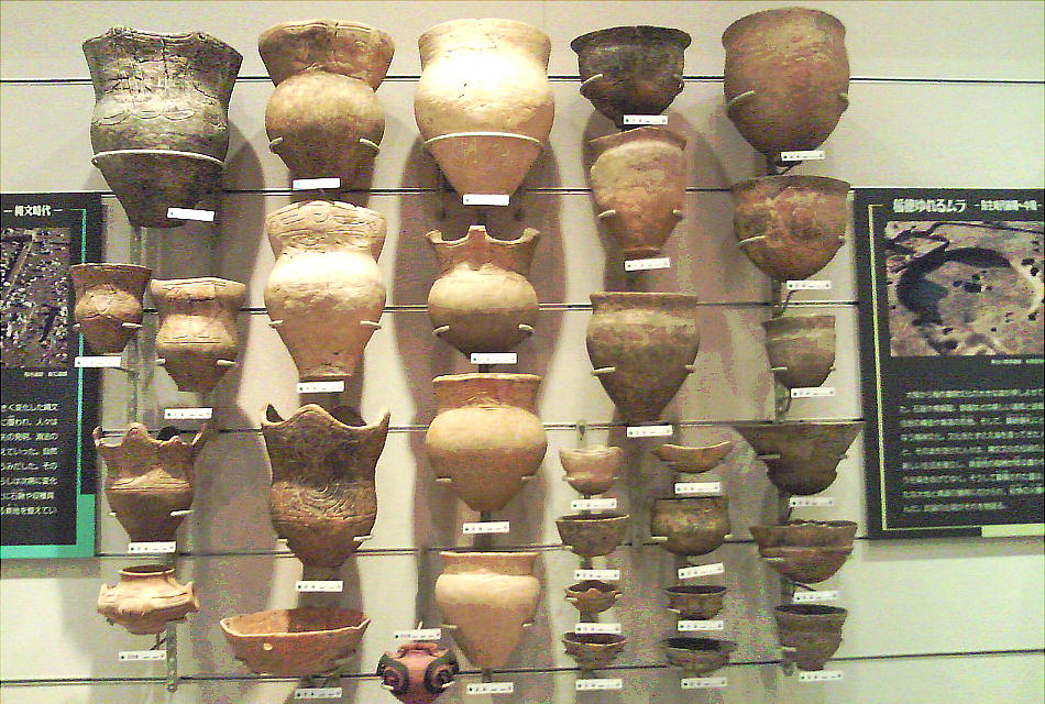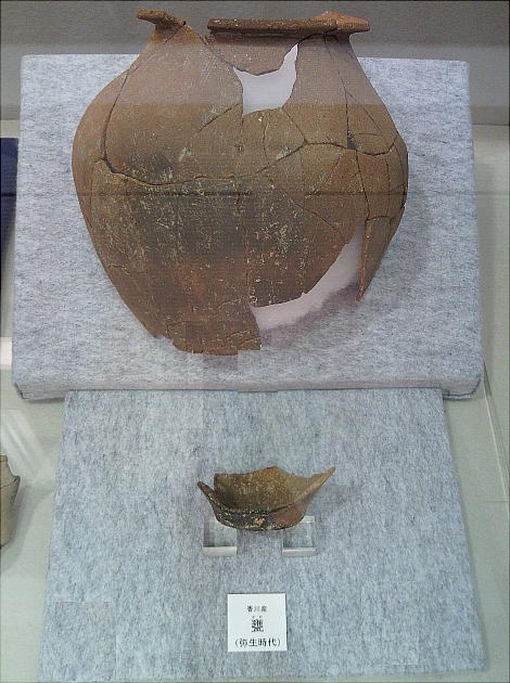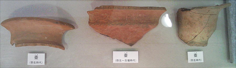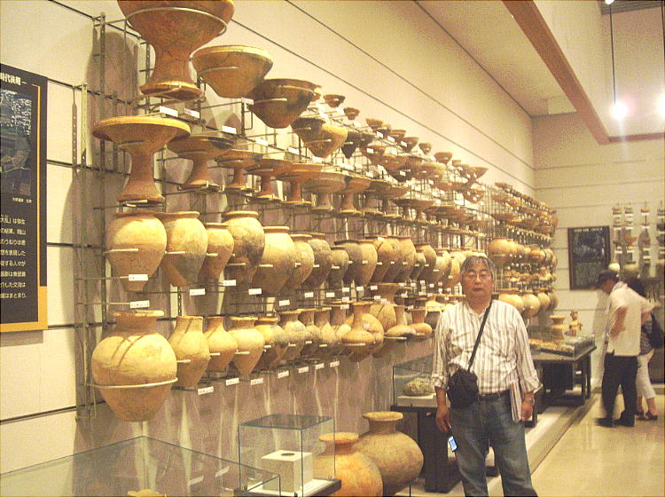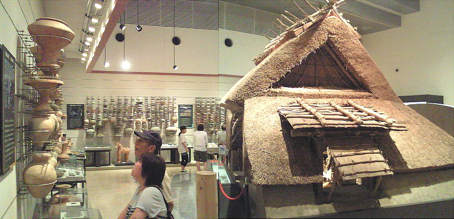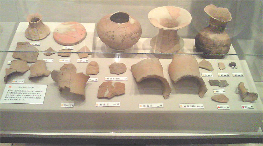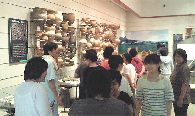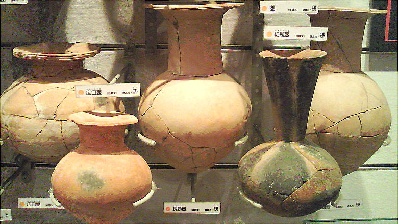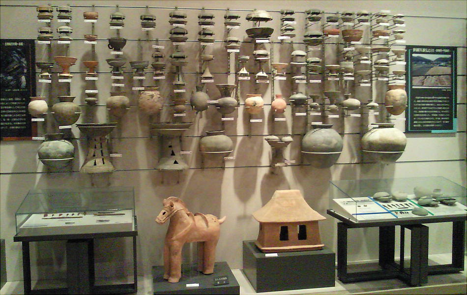 壁面に、縄文、彌生、古墳時代と、時代区分毎の土器が所狭しと並べられていて、一目で時代の違いが判る。