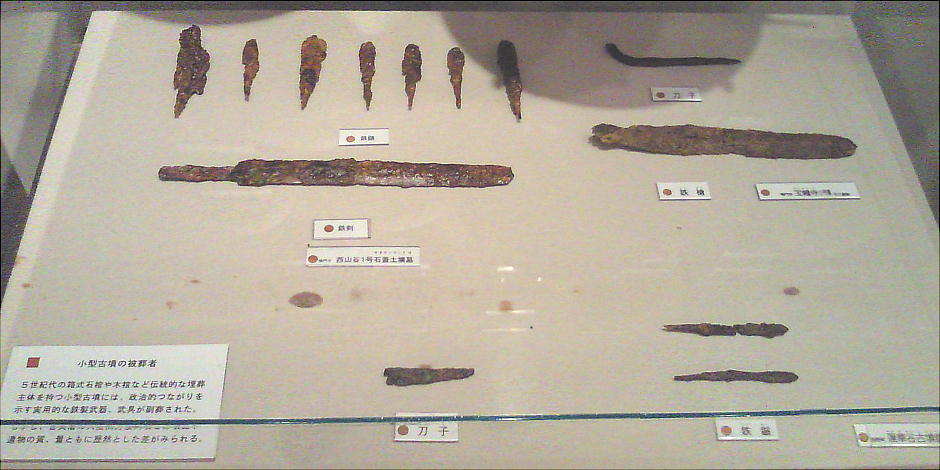 石室に葬られた人物は、朱のまかれた刳抜式木棺(くりぬきしきもっかん)に安置され、銅鏡、鉄剣、鉄槍、鉄鏃、ヤリガンナ、