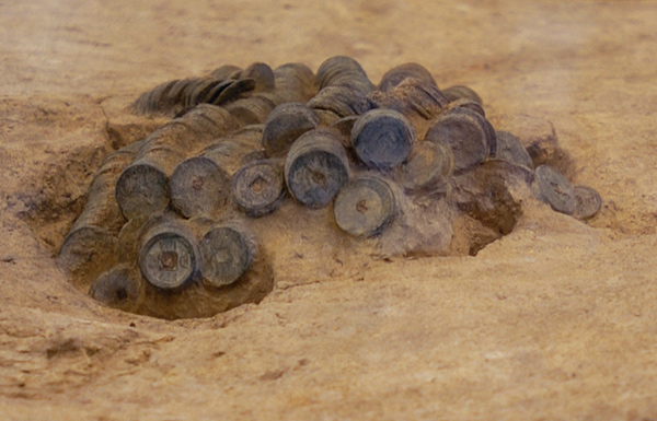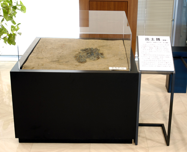 地面に穴を掘り、その中に40本の銭さし(銭緡)が4段に置かれていた。10さし(緡)[一貫さし(緡)]を藁(わら)