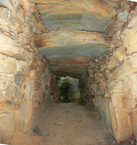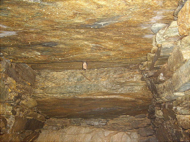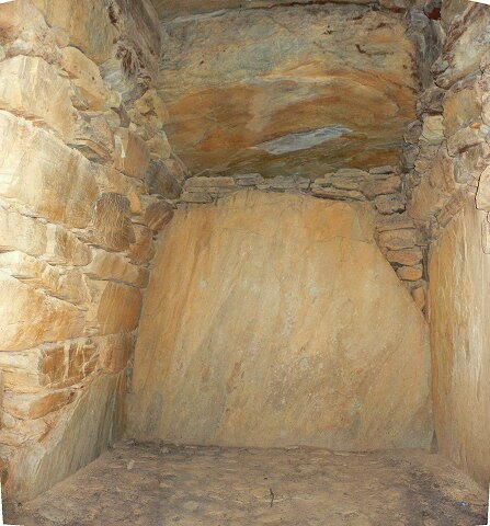 m。奥壁には巨大な結晶片岩の一枚石が使用されており、玄室側壁の基底部と天井にも巨石を使用。玄室の平面プランは長方