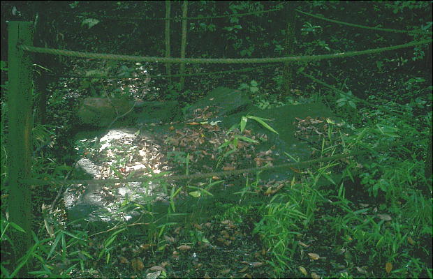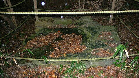 古墳手前に、石棺の蓋のような石材がむき出しで置いてある。入口の扉か何かだったのだろうか。しめ縄で廻りを囲っていた。