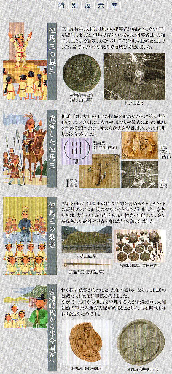 史跡の茶すり山古墳や国の重要文化財である城ノ山古墳の出土遺物等を展示して、但馬の王の変遷をたどる。