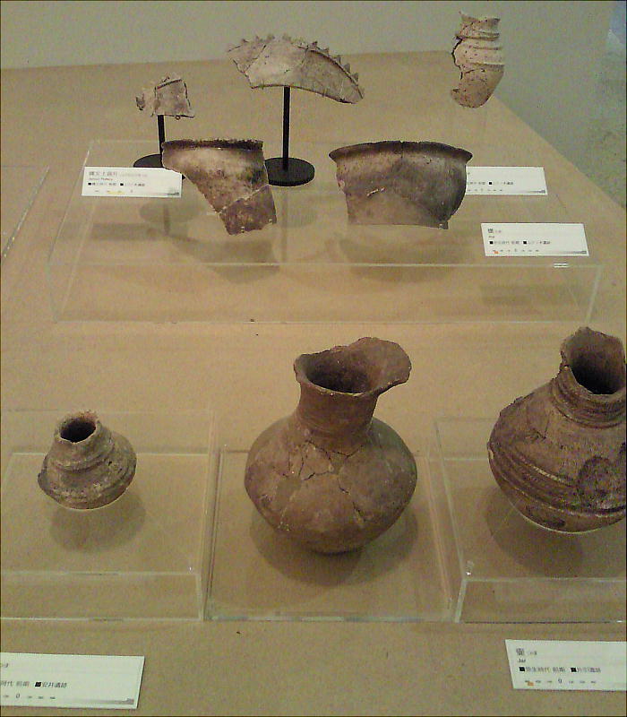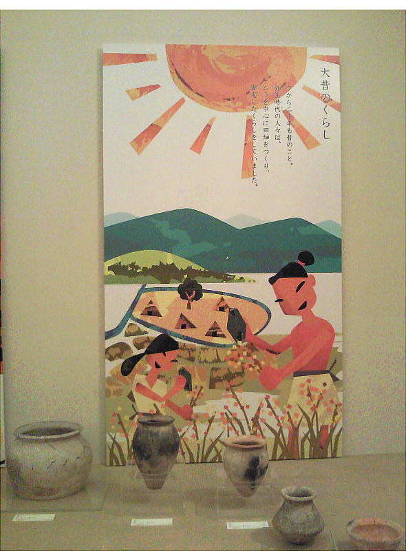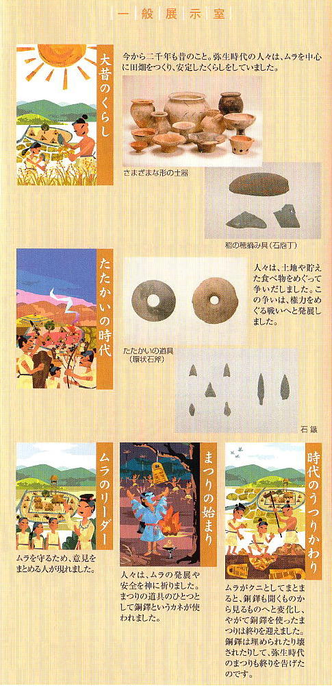 弥生時代に使われた土器や石器などの展示から、古代のくらし振りを示す。また、たたかいが恒常化したことによりムラをまとめる
