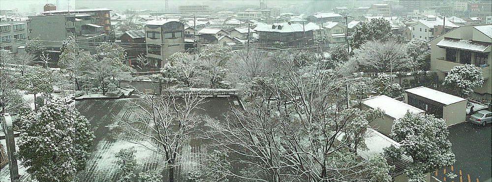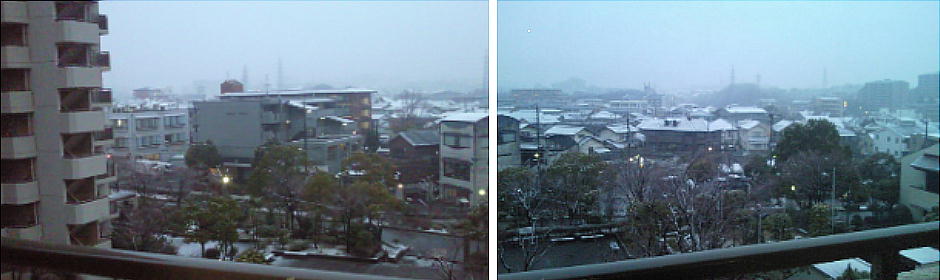 は雪景色で、マンションの廻りも真っ白け。上は夜明け直後で、下はそれから2時間ばかり経った頃だと思う。じゃんじゃん降って