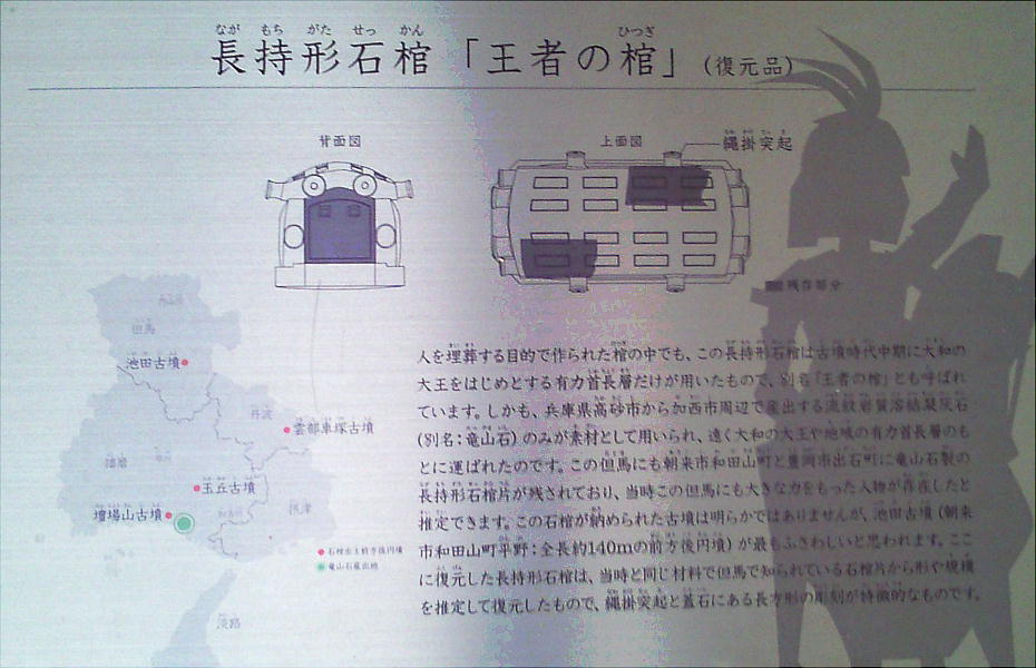 長持形石棺 朝来市内に存在する石棺の一部から推定される長持形石棺を復元している。実物と同じ竜山石を用い、忠実に再現している。