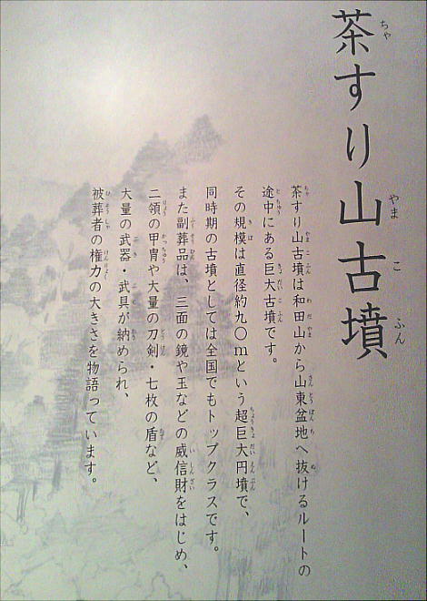から1.5〜2キロぐらいのところに「茶すり山古墳」という径90メートルぐらいの巨大な円墳がある。その茶すり山古墳に葬