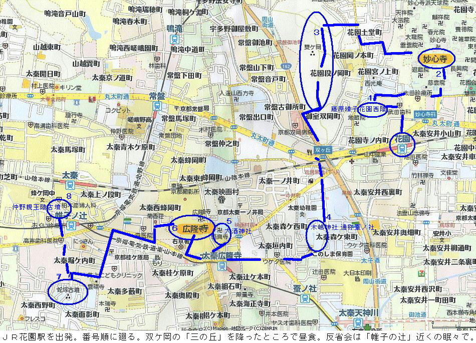 ・JR花園駅−(徒歩10分)−妙心寺−(徒歩15分)−雙ケ岡(双ケ丘) − ここで昼食−(徒歩5分)−藤原璋子花園