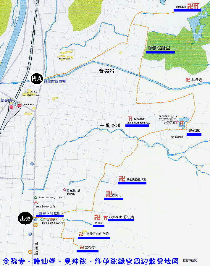 「金福寺・詩仙堂・曼殊院・修学院離宮周辺散策地図」を見ながら読んでください。バスでは一乗寺下り松が出発点です。