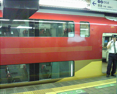 淀屋橋駅で乗った二階建て特急(上左)と、急行に乗り換えるため降りた樟葉駅(と、乗ってきた特急電車)。