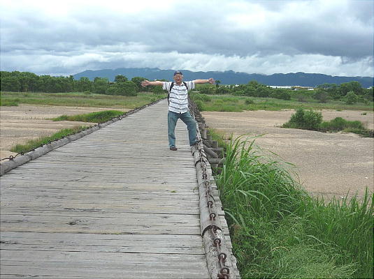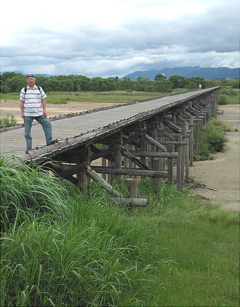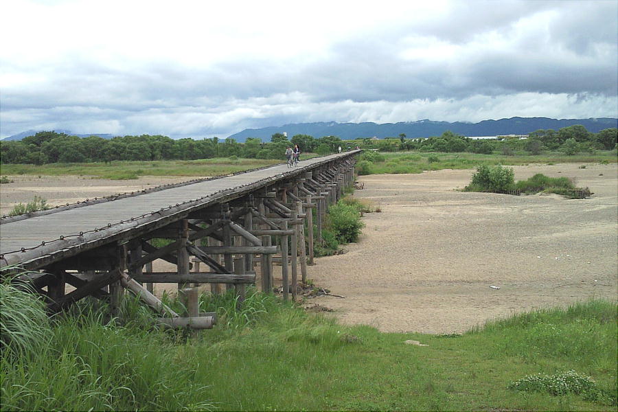 流れ橋遠景。日本一の長さを誇る木造橋である。「流れ橋」というのは、その名の通り、橋が流れるからである。正しくは、上津屋橋