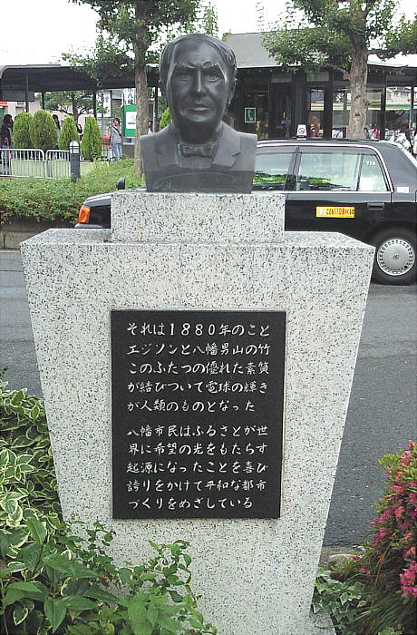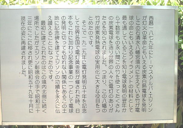 京阪八幡駅に集合し、ここで錦織さんが教えてくれた「無料のサイクル自転車」を借りて流れ橋へ向かう。駅前には勿論エジソンの記念碑が。