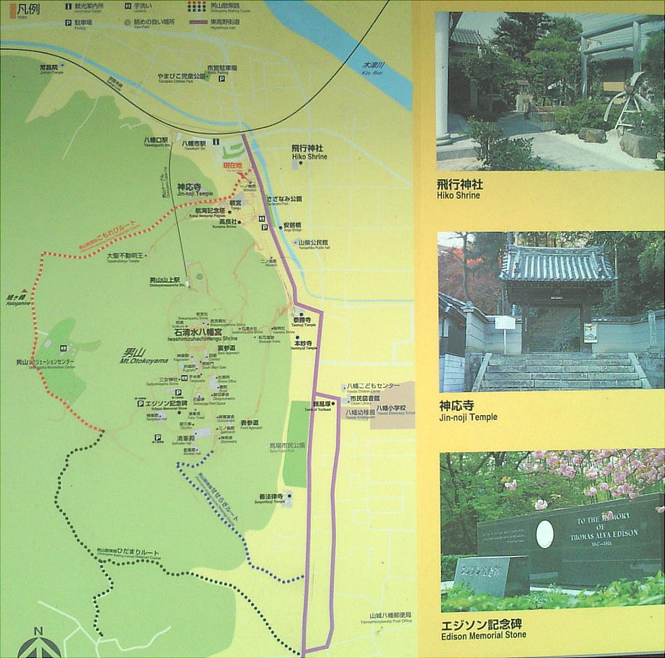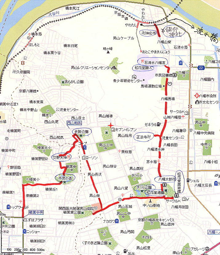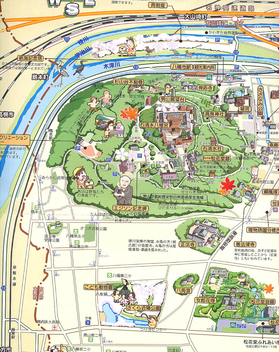 散策路:■八幡市駅→■流れ橋(時代劇など、映画撮影が盛んに行われている)→■飛行神社→■神応寺→■石清水八幡宮→