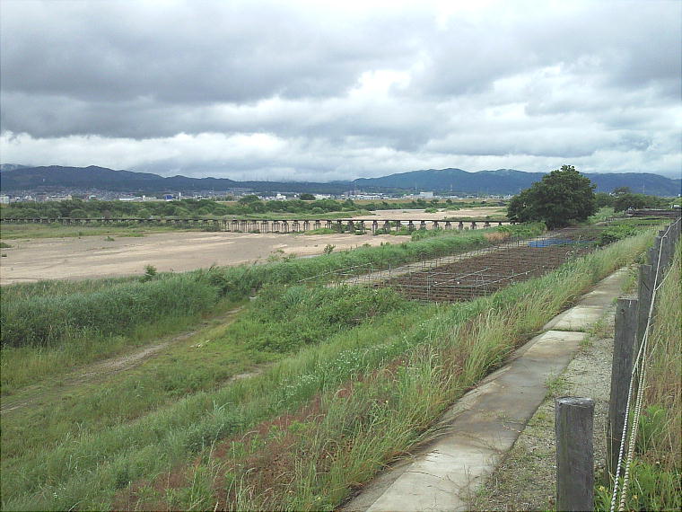 木津川の堤防から見た八幡の町。木津川はここで桂川・宇治川と合体し、淀川となって大阪へ流れる。
