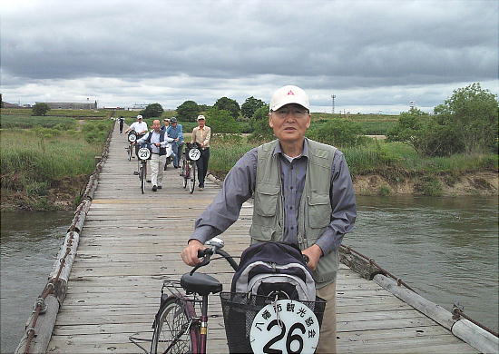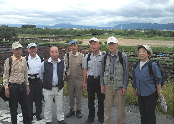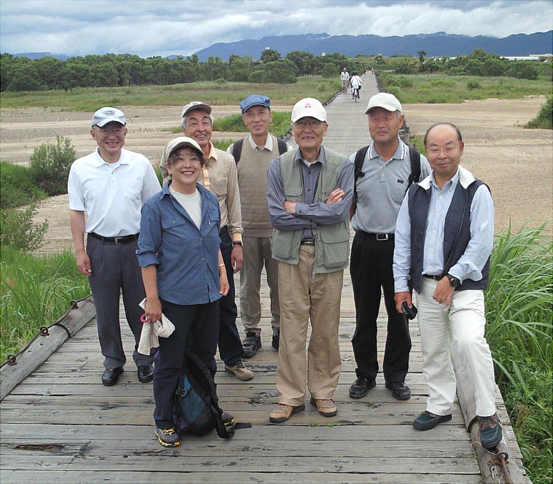 流れ橋をバックに、「世界へ発信」記念撮影。本日の参加者全員。