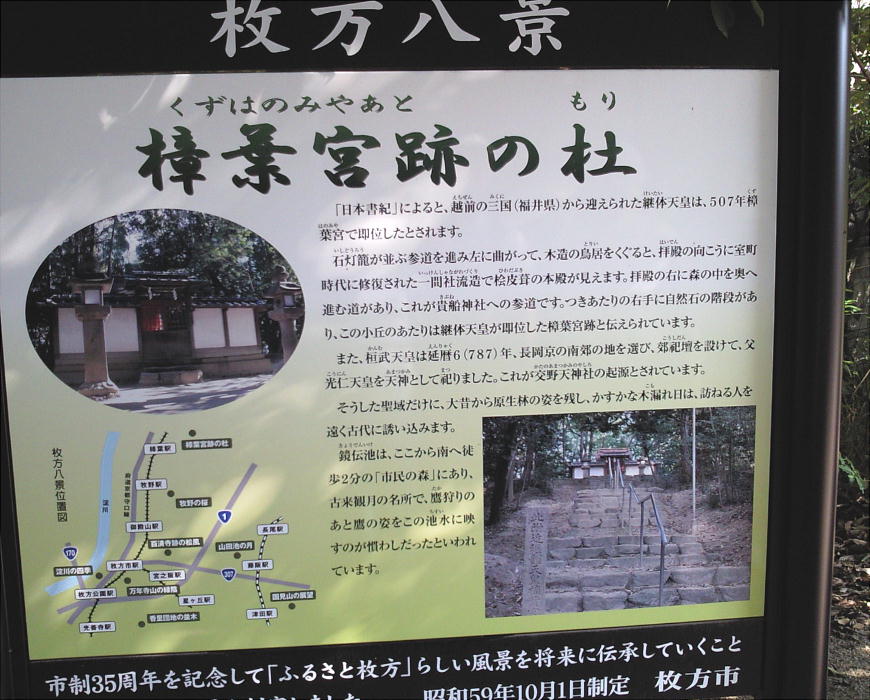 1984年に枚方市から「枚方八景」の一つ 「樟葉宮跡の杜」に指定された。最寄駅:京阪樟葉駅より北東へ2km。樟葉駅発着のくずは丘