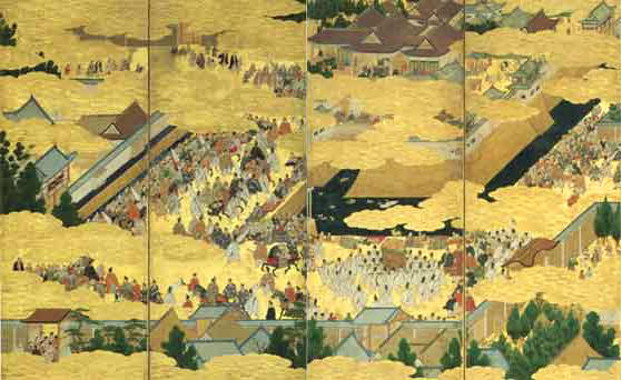 ・「聚楽第行幸図屏風」 二曲一双 紙本金地著色 安土桃山〜江戸時代初期 堺市博物館所蔵◎