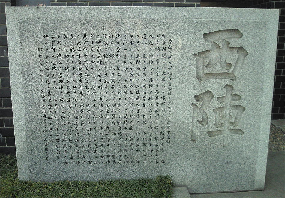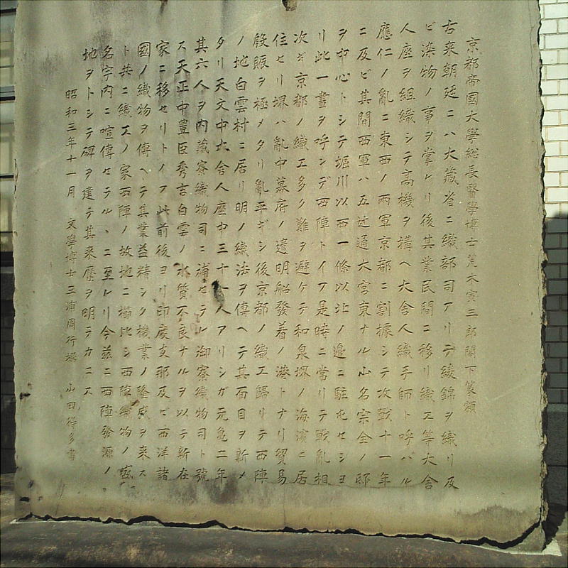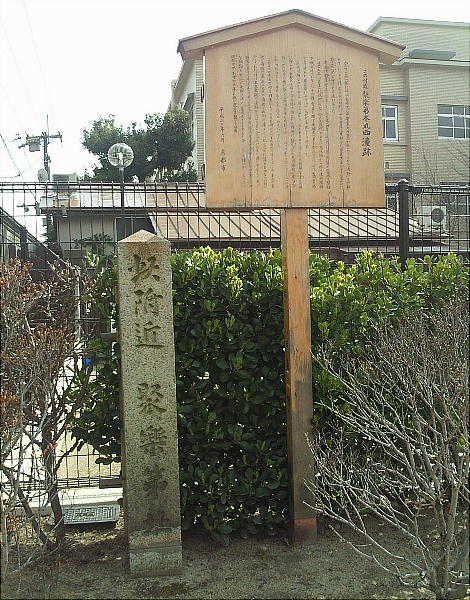 この石碑は、1992年(平成4年)の発掘調査で本丸東堀跡の遺構が見つかり大量の金箔瓦が出土した西陣公共職業安定所の北に建