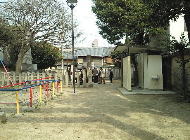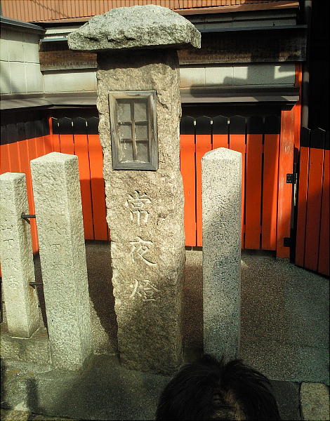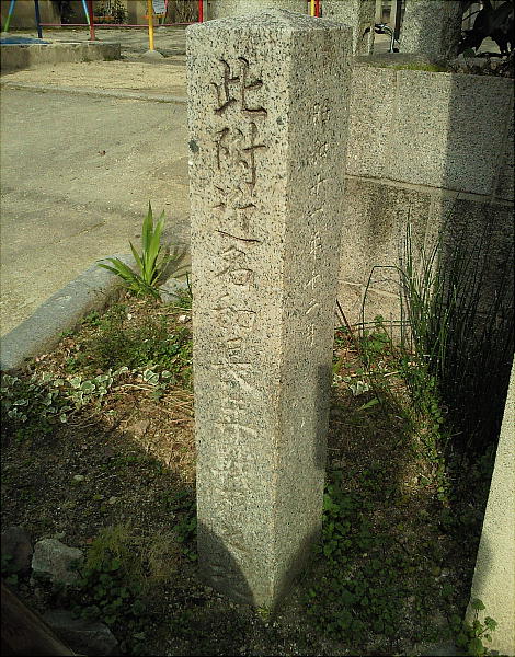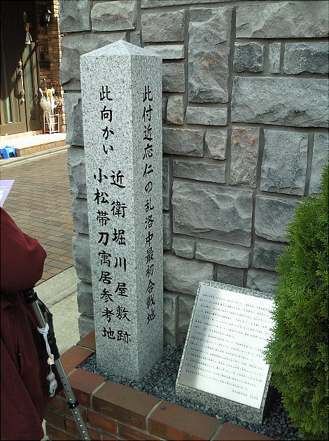 常夜灯の右側に建っている石碑が「聚楽城鵲橋乃旧蹟」碑である。文字がかすれてろくろく碑文も読めない。