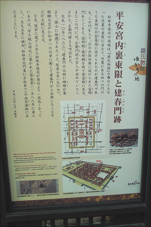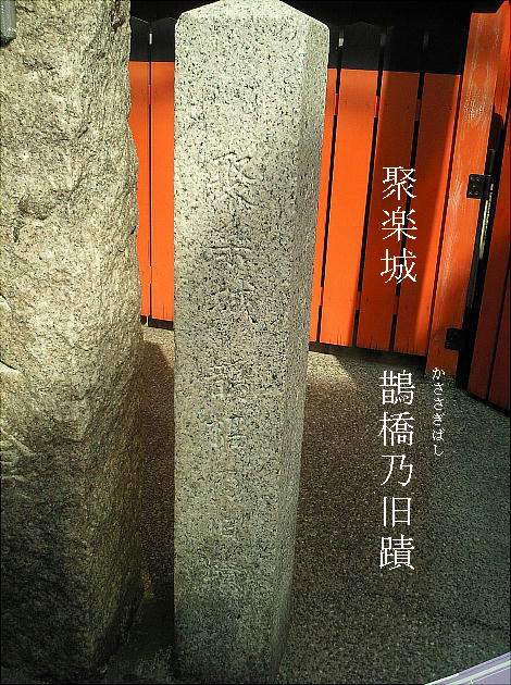 「松屋町出水通上ガル」東側に松永稲荷がある。ここに聚楽城鵲(かささぎ)橋旧跡の石碑がたっている。鵲橋とは、「聚楽第の