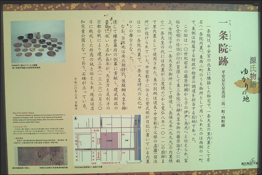 深さ8.4m、幅40mと推定される聚楽第東堀跡が検出され、大量の金箔瓦(重要文化財)が出土した。石碑がある地点は聚楽