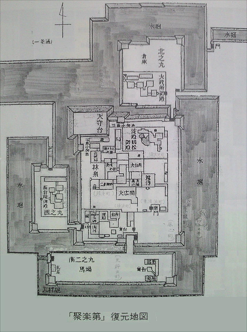 聚楽第は、「第」(= 邸)とあるが、本丸を中心に、北の丸・西の丸・南二の丸などの曲輪を持ち、堀を巡らせた平城であった。