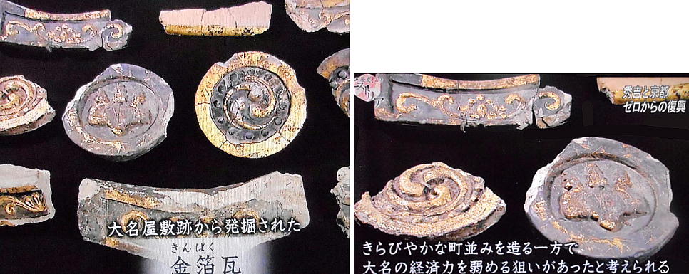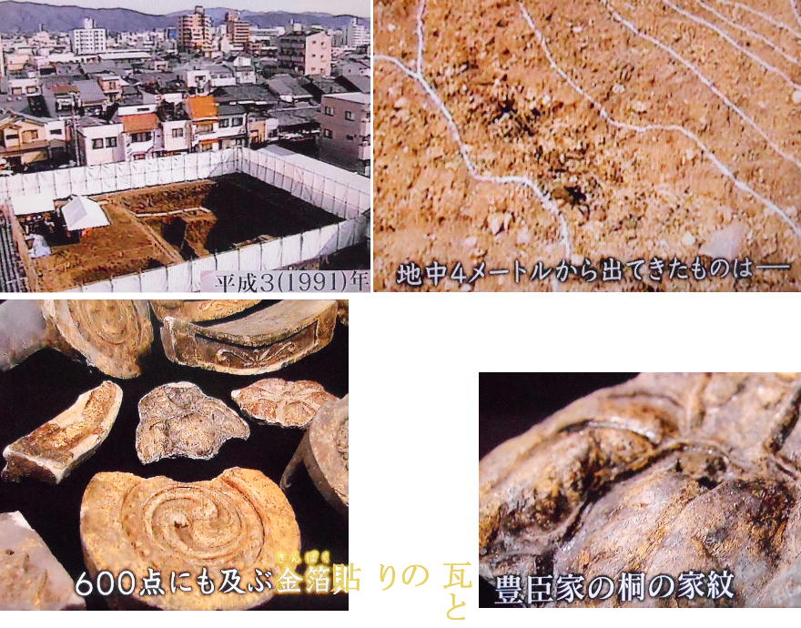 え工事が行われていた1992年(平成4年)に、工事現場の地中から金箔の付着した瓦約600点が出土した。そこは聚楽第本丸東堀が