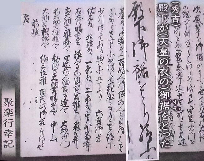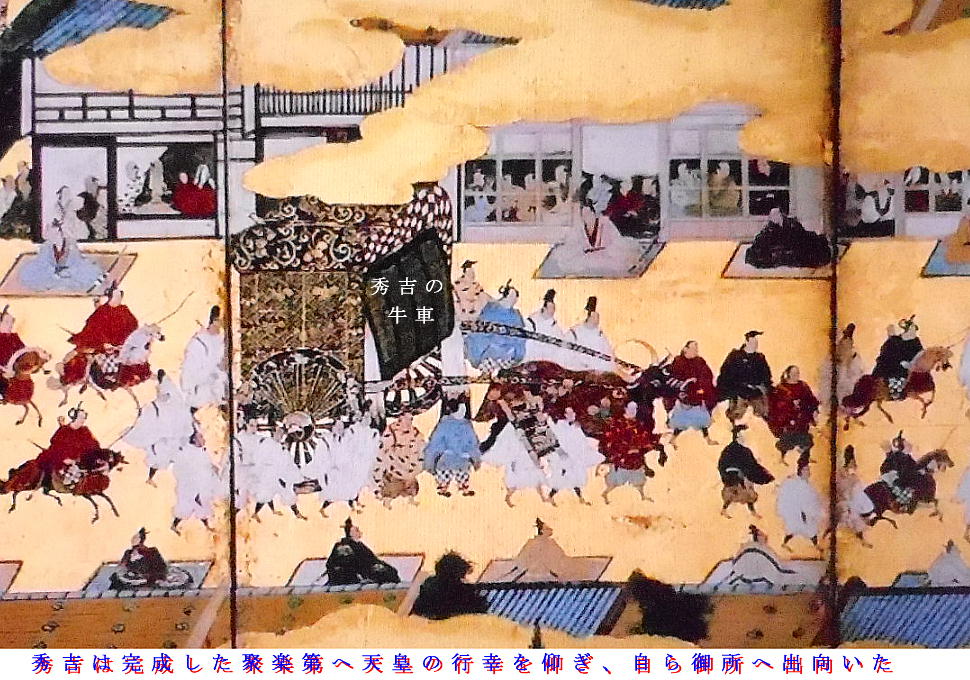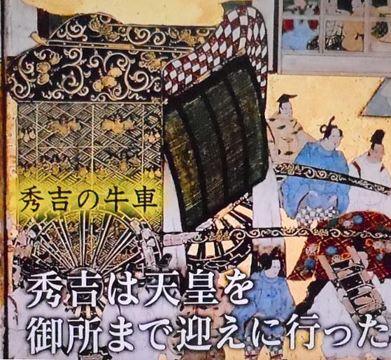 秀吉は天皇(後陽成天皇?だったかな)の衣の裾を自ら掲げて牛車へ乗せ、天皇との親しさを廻りにアピールした。