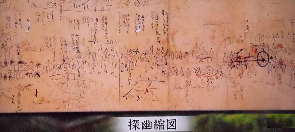 その行幸の様子を描いた戯画。徳川家康、前田利家、石田三成などが秀吉に従って進み、世間に秀吉の天下人振りを誇示した。
