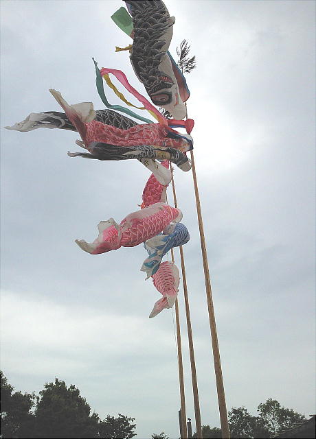◆ 5月晴の空に鯉のぼりもゆうゆうと泳ぐ。公園内には弥生時代の?生を再現している。