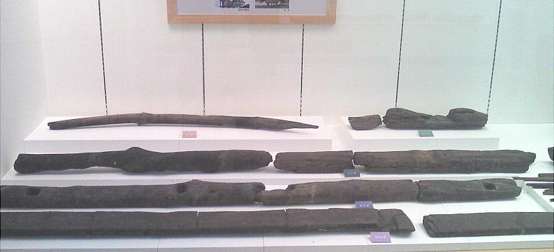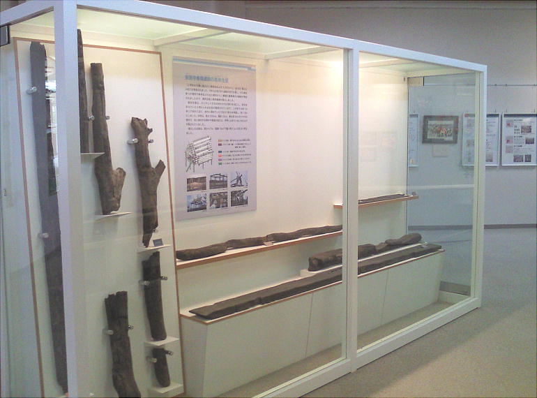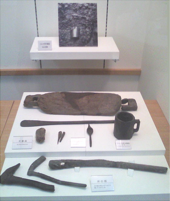 つぎに遺物では、大量の土器と農具をはじめとする木器・建築部材とみられる大形の加工木材など、低湿地ならではの豊富な遺物が出