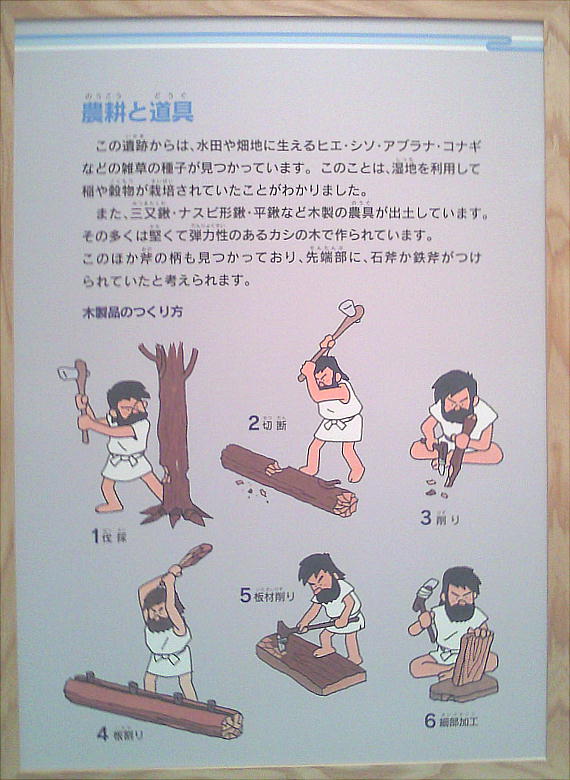 掘調査が実施され、大溝泥炭層中より、住居あるいは高床倉庫のものとみられる建築部材をはじめ、三又鍬や手斧(ちょうな)柄とい