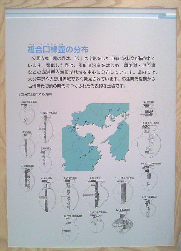 また、複合口縁の壷形土器で口縁部に櫛描波状文(くしがきはじょうもん)を施した、東九州の弥生時代終末を代表する「安国寺式土