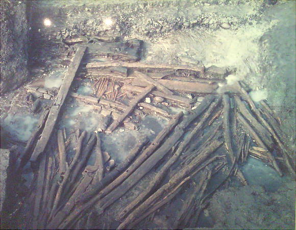 〈多量の木器 木材を出土〉