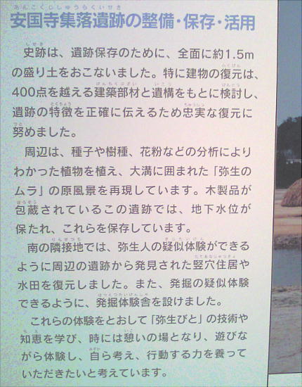 プラントオパール分析から当時の自然環境も復元されている。現在では国史跡に指定され、「安国寺集落遺跡公園・弥生のムラ」とし