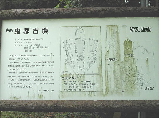 鬼塚古墳を特徴づける線刻画は、玄室奥壁ならびに左右の壁の各1石にみられる。壁石の表面がやや風化して柔らかいため後世の追刻