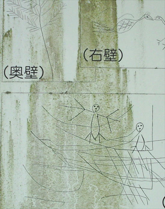 帆船や鳥獣、樹木などが、また右側壁には向い合う二羽の鳥が、左側壁には群れなす鳥が、それぞれ単調な線刻で描かれている。右側
