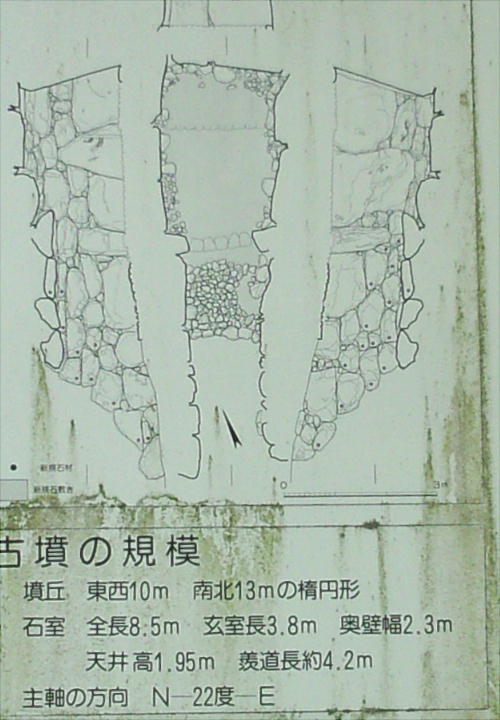 石室は大形の安山岩(あんざんがん) 系石材を用いた「羽子板《状を呈する単室の横穴式石室 である。玄室(げんしつ)の規模は奥行き