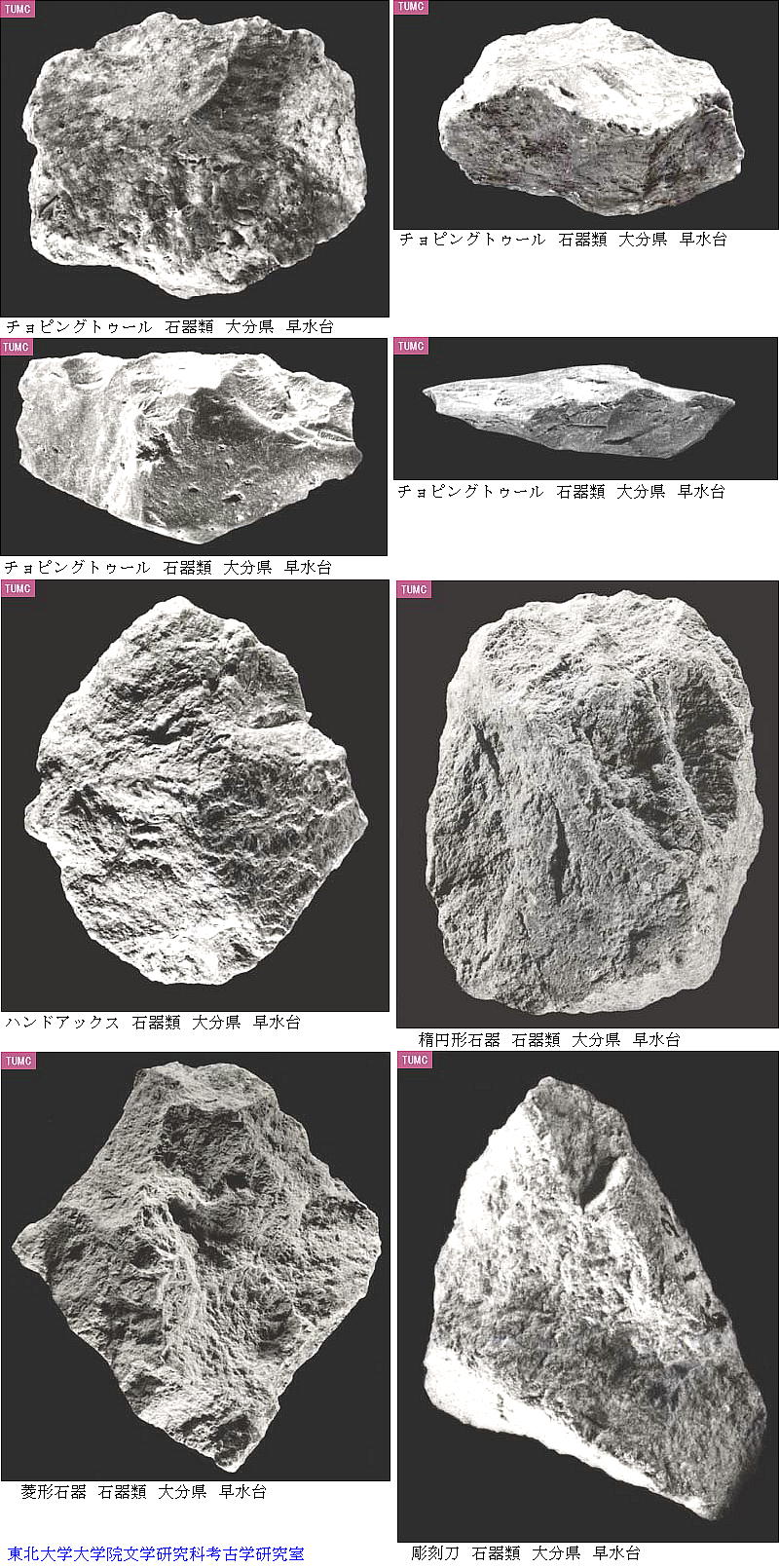 証が期待されている。このとき出土した遺物は、石英脈岩、石英粗面岩製の礫器、祖型ハンドアックス、ピック、尖頭石器、剥片、