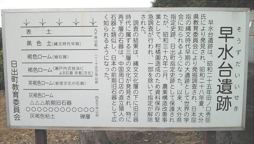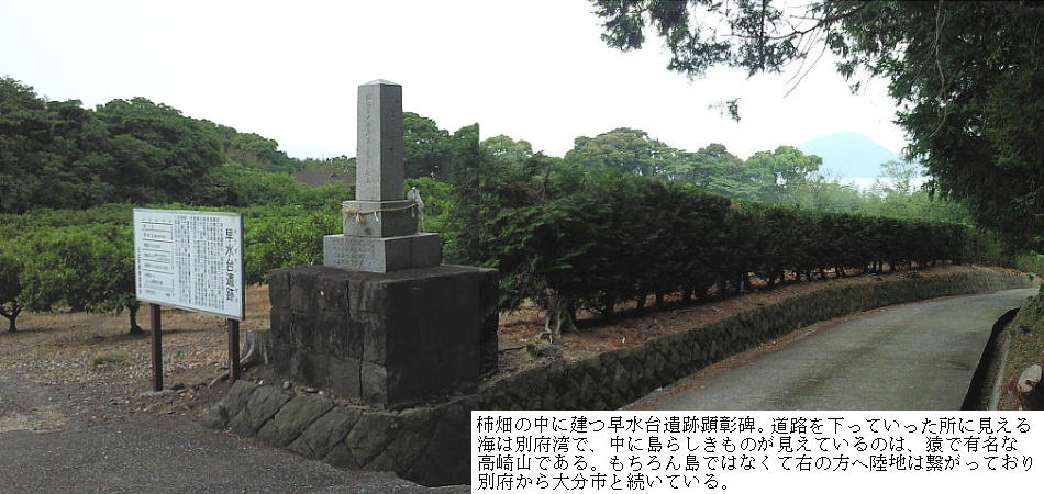早水台遺跡は速見郡日出(ひじ)町大字川崎字西深江にあり、なだらかな丘陵地帯で、南西は海蝕によって断崖をなして別府湾に