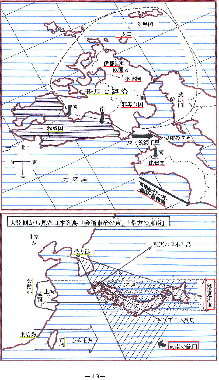 する「狗奴国」があるという位置関係は一致する。南北の軸に対し東西の線、即ち、「女王国より東、海を渡ること千余里」の「別の