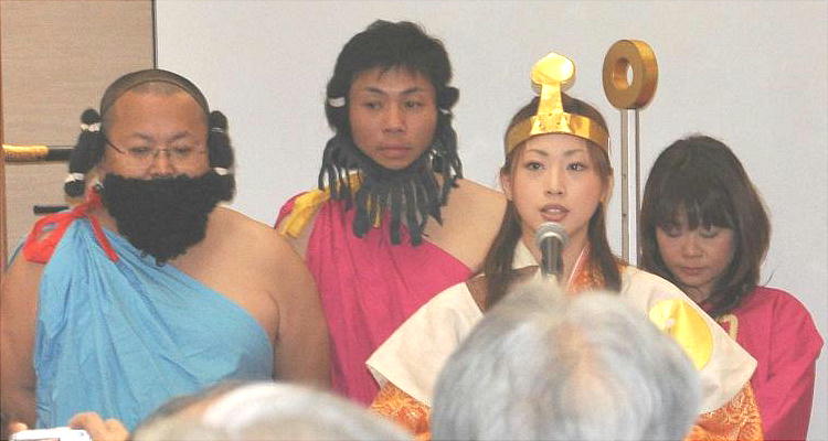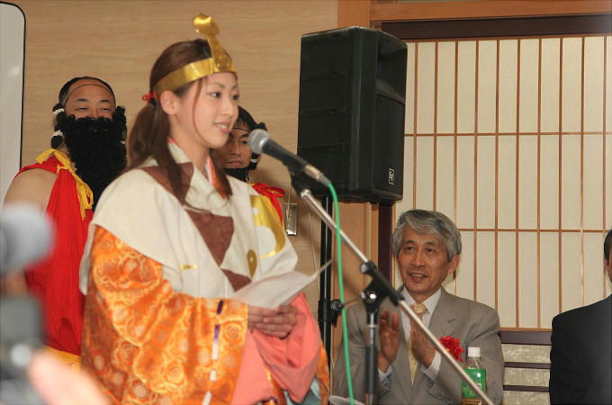 ◆ 可愛い卑弥呼の挨拶に、安本先生も思わずほほえんで。