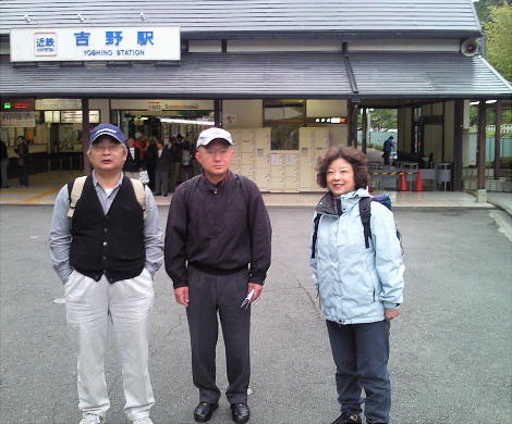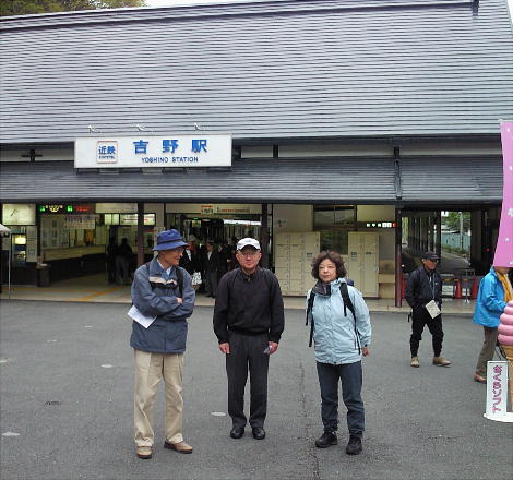 吉野駅前にて記念撮影。本日の例会は実は前日までに「中止」となっていたのである。前日まですごい雨で、これでは道路はぬか