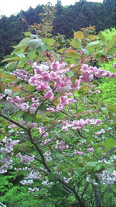遅咲きの八重桜が、ポツリ、ポツリと新緑の山肌に色合いを添えていた。