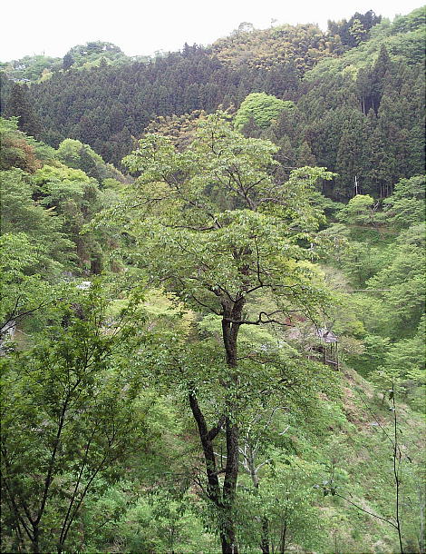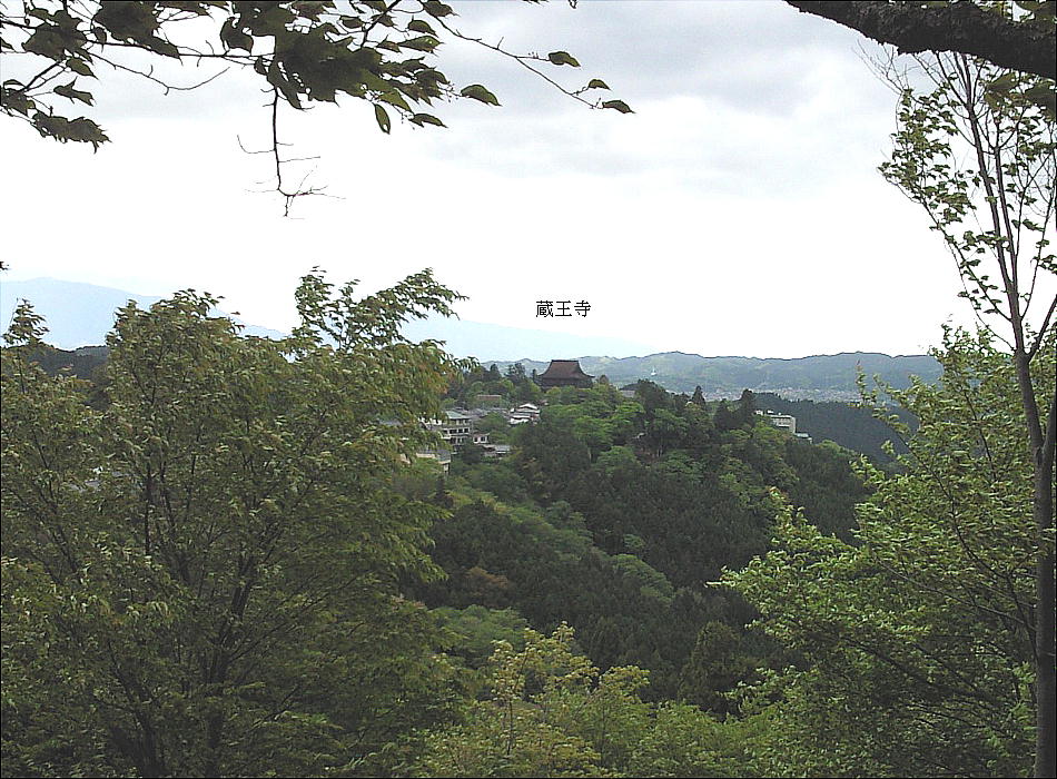新緑の中から蔵王寺付近を眺める。桜の季節には廻りが白とピンクに染まる。逆光なので写りは余り良くないがすばらしい光景だった。