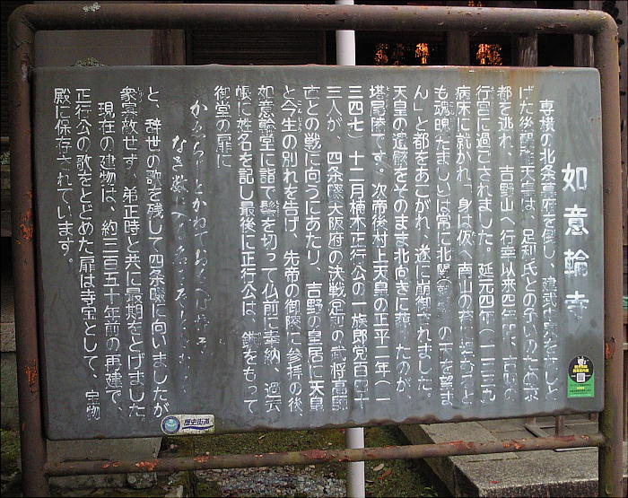 正平2年12月(1346年)、楠木正成の長男・楠木正行が四条畷の戦いに出陣するに際し、一族郎党とともに当寺にある後醍醐天皇陵
