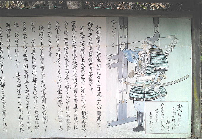 楠木正行が四条畷の戦いに出陣する時に、「かへらじとかねて思へば梓弓なき数に入る名をぞとどむる」と本堂の扉に辞世の歌