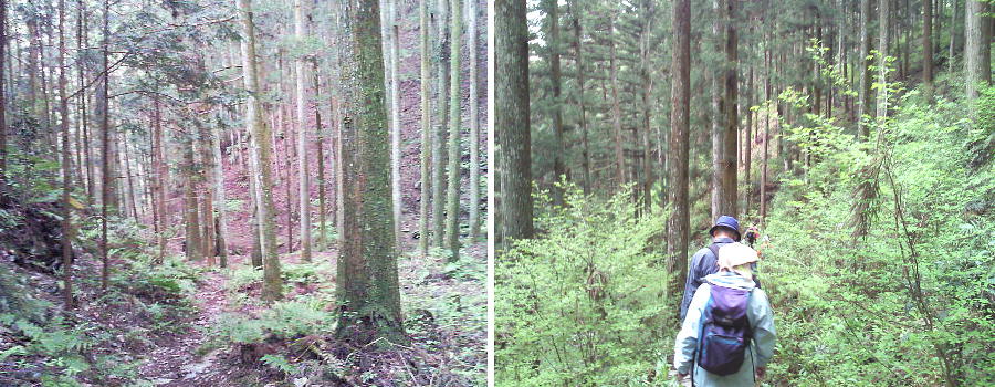 ここからは吉野杉の林の中を、ただただ降ってゆく。辺りは鬱蒼とした杉の森に覆われ、木漏れ日が暖かい。これなら夏は相当